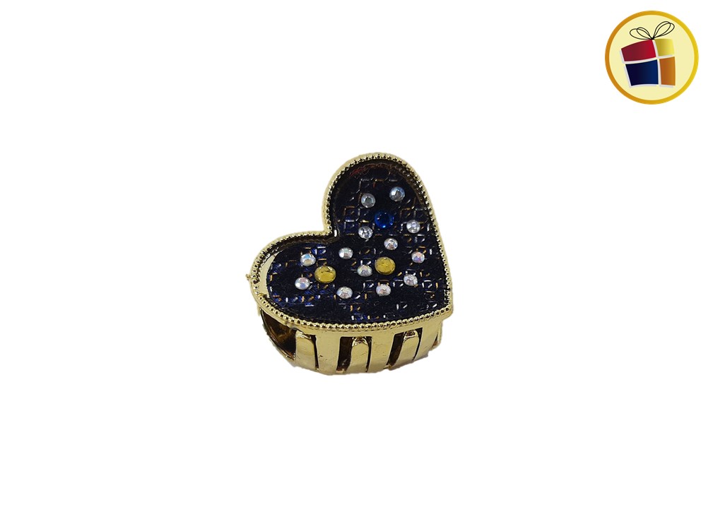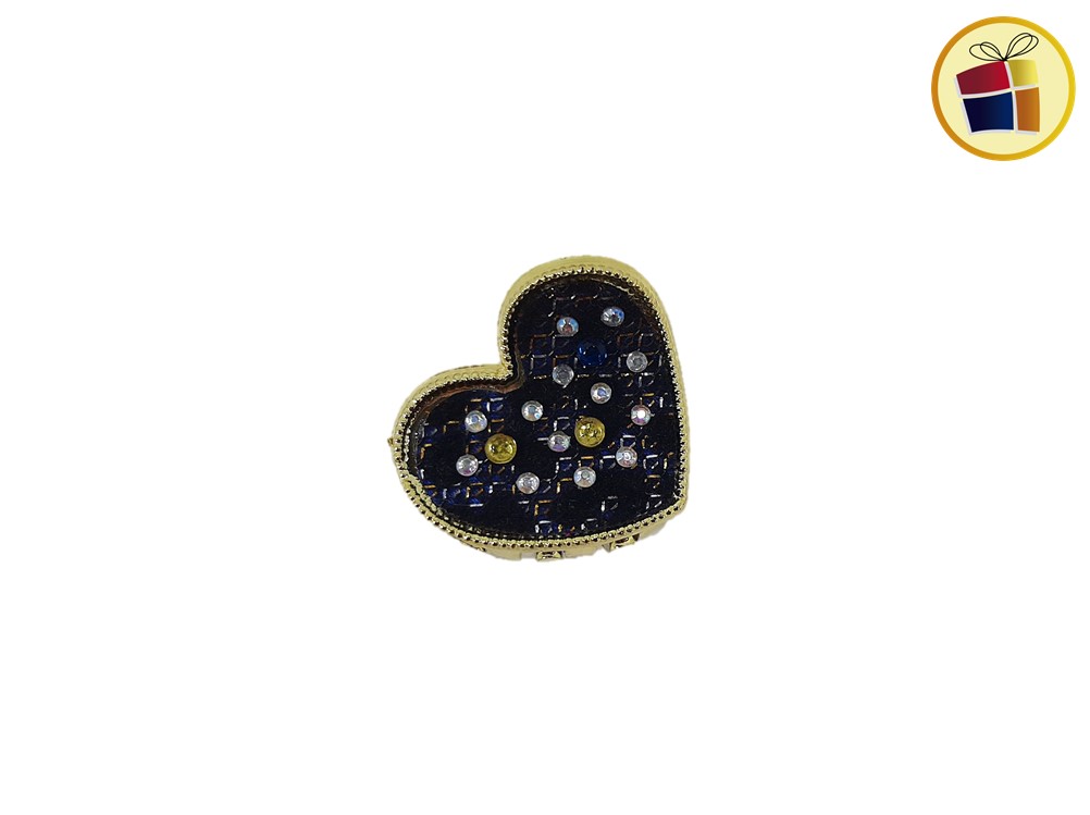 Broche forma de corazon con stras de color y tela gamusada.