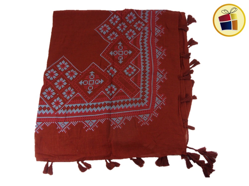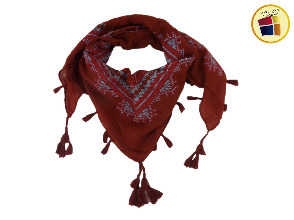 Chalina para dama cuadrada con estampado de mandalas y pompones al rededor, ideal para usarlo en triangulo.