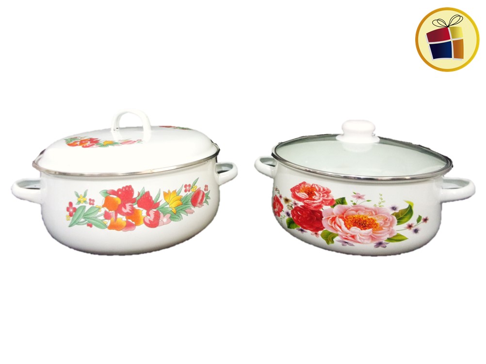 Enlozada con asas y tapa vidrio o enlozado, surtido en estampado.